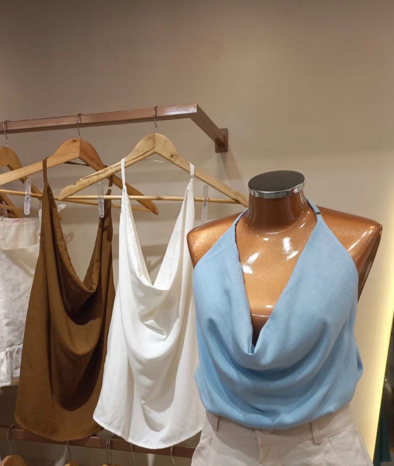 BLUSA COM FRENTE ÚNICA E COM CAIMENTO , E COSTA FECHADA DA CINTURA PRA BAIXO E ELÁSTICO
